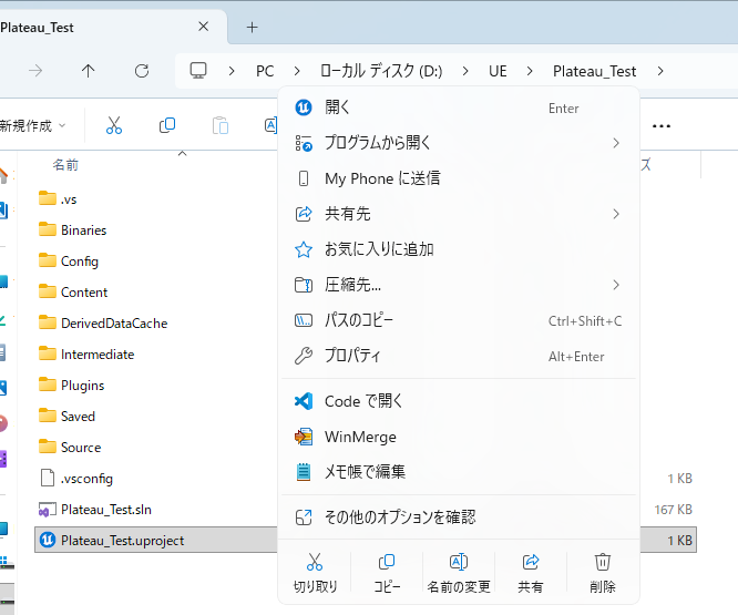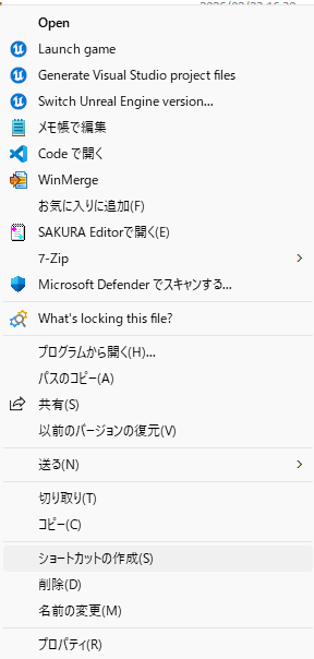 「プロジェクト名.uproject」ファイルがあると思うのでそのファイルを右クリック。