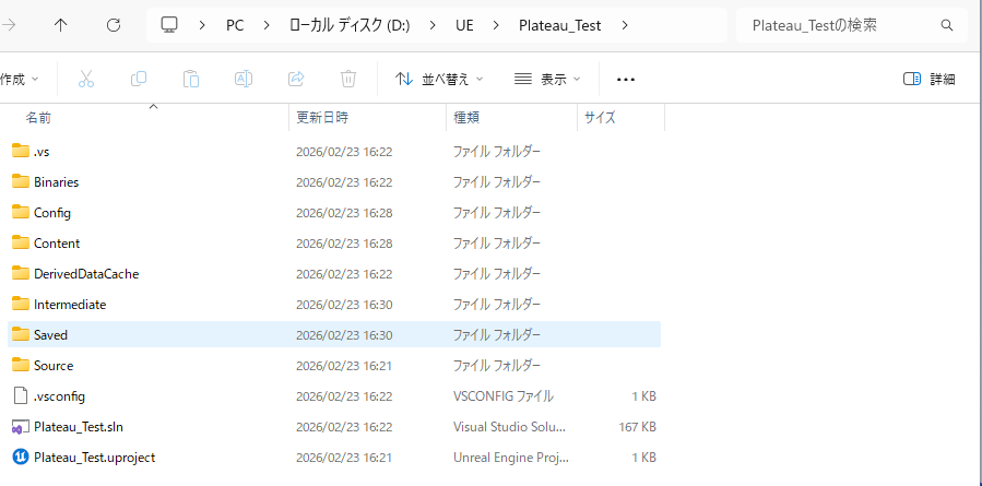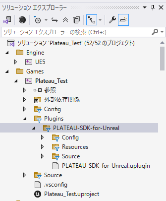 slnを開いて「ソリューションエクスプローラー」のGame→プロジェクト名→Plugins→PLATEAU-SDK-for-Unrealの表示があれば成功しています。