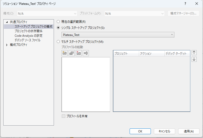 共通プロパティのスタートアッププロジェクトの構成の部分が